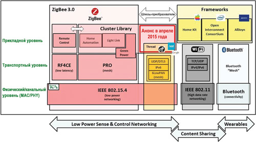 Рис. 5. Обзор ZigBee и проприетарных фреймворков после апрельского анонса 2015 года об интеграции ZigBee Cluster Library в сети Thread