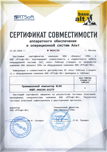 «Базальт СПО» и «РТСофт-ВС» подтвердили совместимость операционной системы «Альт Рабочая станция» 11 с российскими промышленными безвентиляторными компьютерами BLOK.